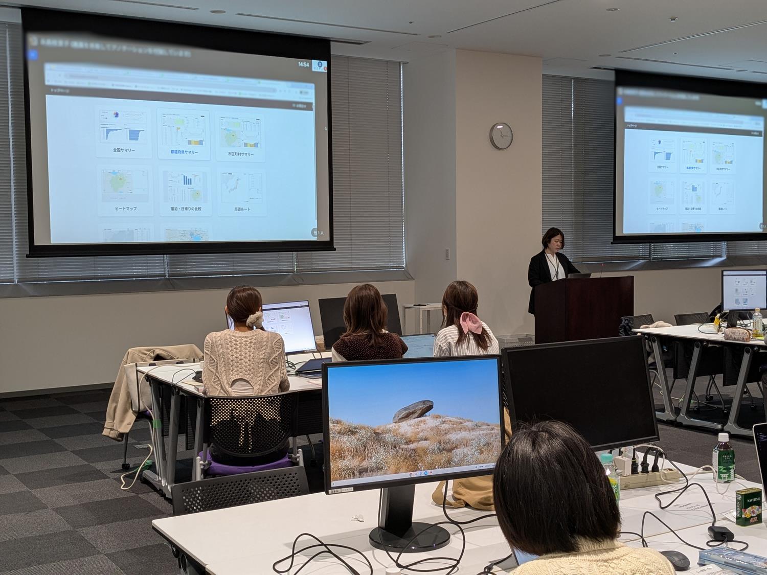 最初に講義形式で、ナビタイムジャパン社が保有する移動データの概要と、それらのデータ分析が観光分野のコンサルティング業務にどのように活用されてきたのかについて説明を受けました。続いて、参加学生は6つのチームに分かれ、ナビタイムジャパン社が提供する訪日外国人動態分析サービスであるGISベースのダッシュボード「インバウンドプロファイラー」を用いて、それぞれが設定した対象地域におけるインバウンドの課題を分析しました。さらに、その分析結果を踏まえ、「誰を」「どの時期に」「何をする旅か」という観点から、ターゲット・時期・行程を具体化した観光戦略を作成しました。