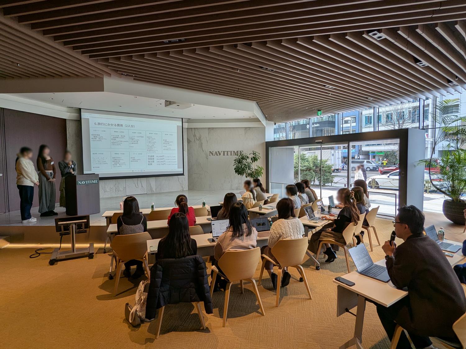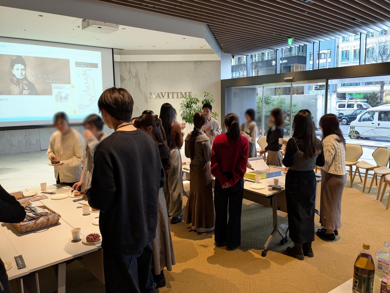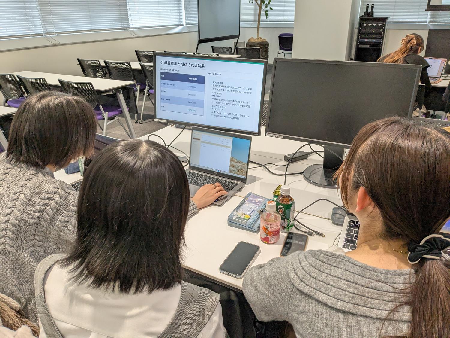 最終日には成果発表会を実施し、各チームが作成した観光戦略について、ナビタイムジャパン社の社員より、実務経験に基づく講評をいただきました。その後、最優秀チームが発表されました。さらに、社員が考案した観光戦略の一例も紹介されました。授業後には、ナビタイムジャパン社のオフィス見学を行い、社員の方々にもご参加いただいた懇親会を開催しました。