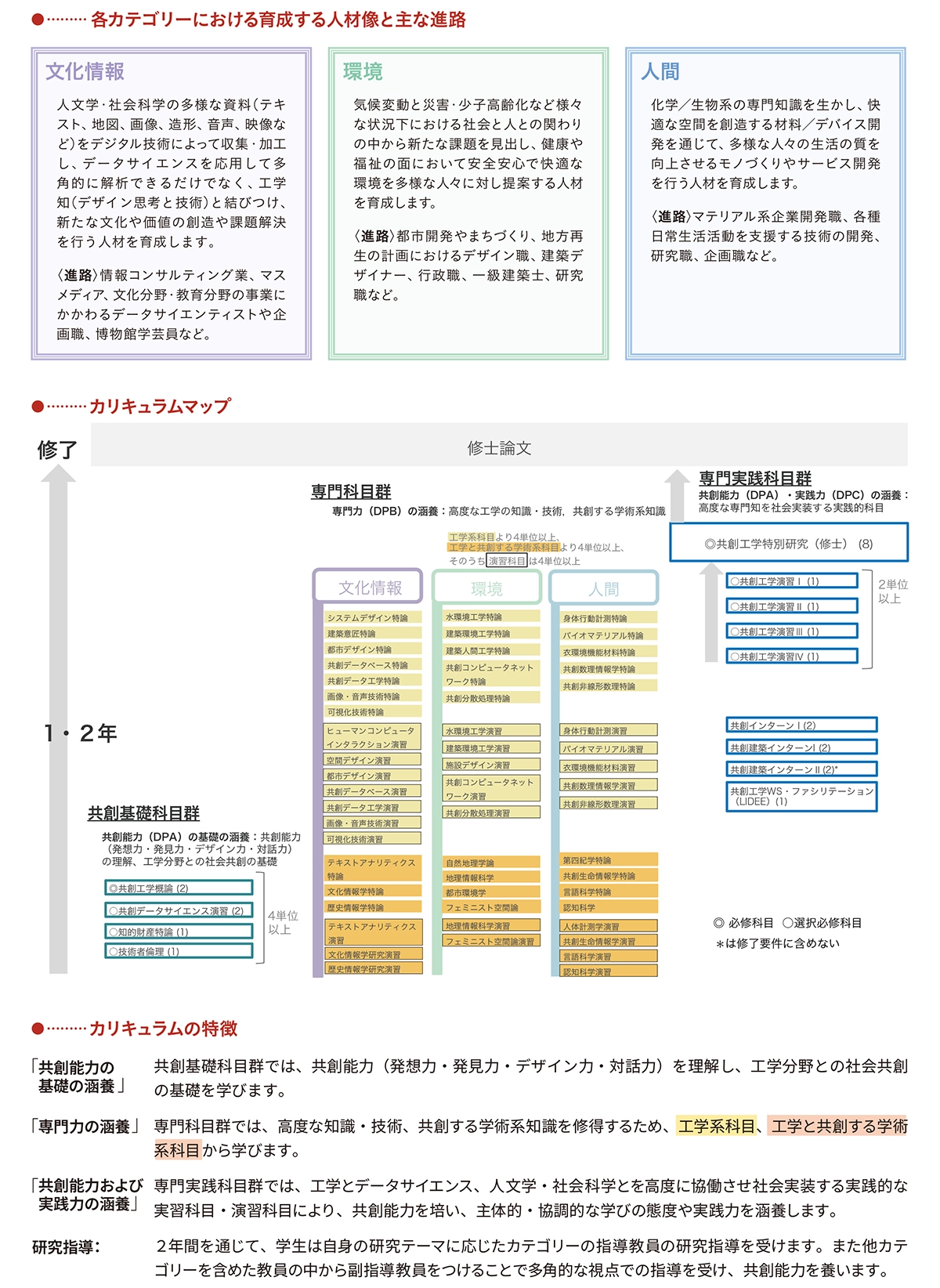 - 幅広い工学と、人文学・社会科学の専門領域を協働させ、新しい技術や文化すなわちモノ・コトを工学的手法によって創造することかできる能力