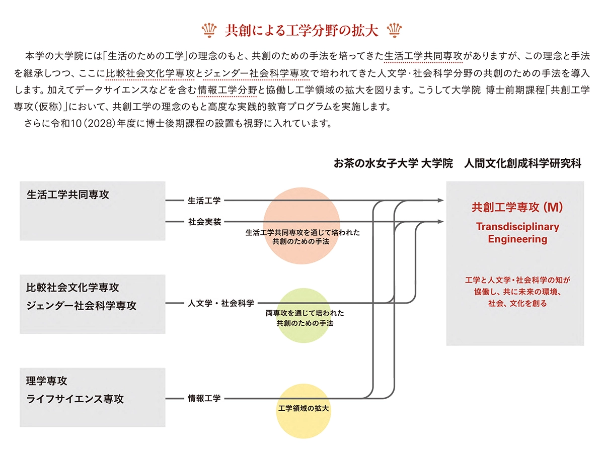 こうした背景のもと、お茶の水女子大学は2024年度に文化・社会の知と工学を協働させる共創工学部を設立し、安全・安心・快適な社会を支える技術と文化の創造を目指してきました。大学院博士前期課程「共創工学専攻」は、この理念を継承し、さらに高度な専門性と実践力、リーダーシップを備えた専門家を育成するための高度な実践的教育プログラムを実施します。